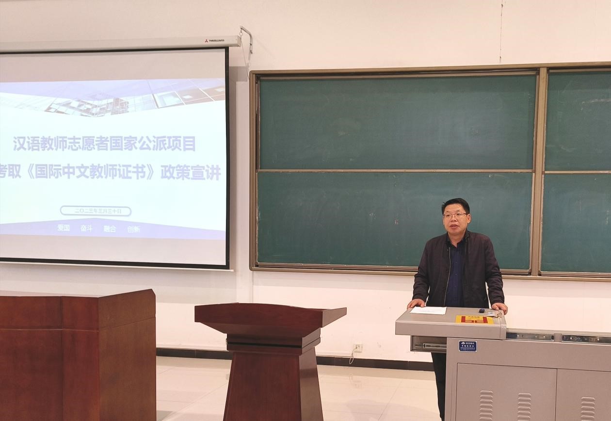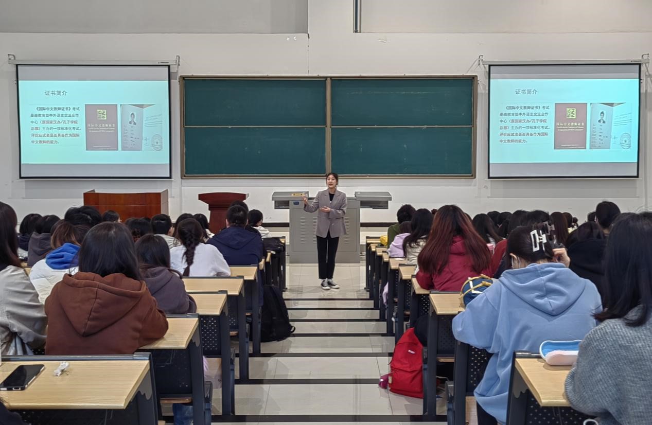 為進一步做好學生職業規劃,促進畢業生高質量就業。3月30日學院在石工地科樓115舉辦漢語教師志愿者國家公派項目政策宣講會。邀請陜西省漢語國際教育研究會副秘書長、《國際中文教師證書》西安外國語大學認證中心考務負責人張青作專題宣講。副書記王業青主持,輔導員陳浩及2019級、2020級本科生和2022級研究生共計200余人參加了此次宣講會。