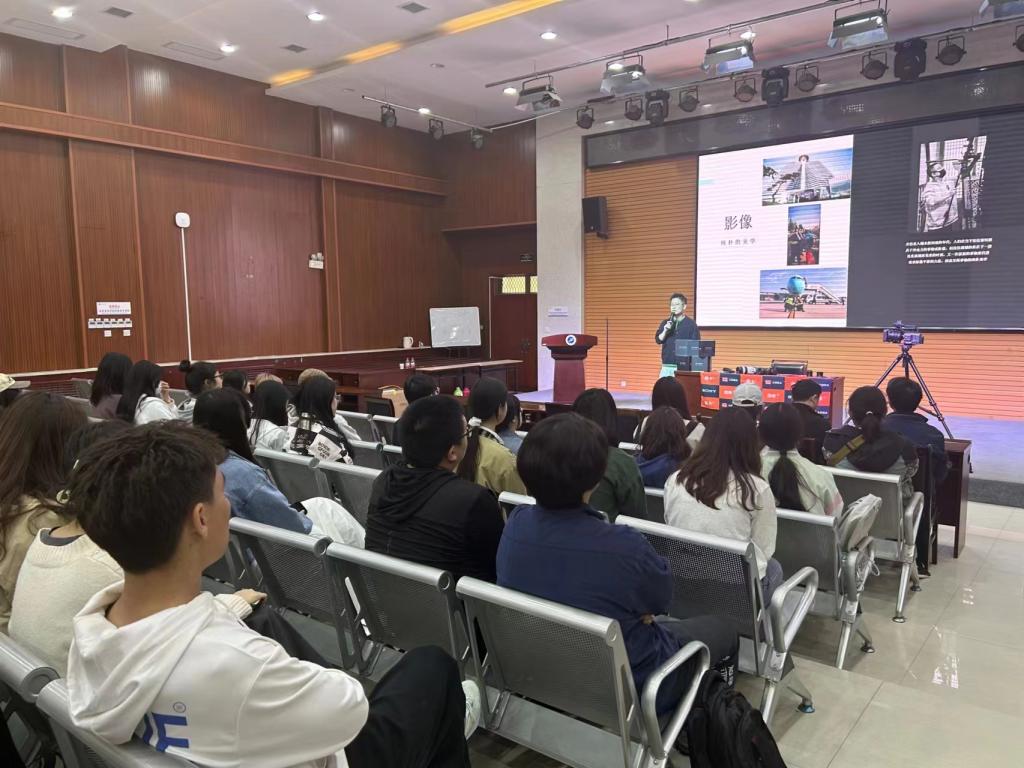 在講座上,王健向同學們講解了如Alpha 7S III、FX3、FX6、A7M4等多種器械的特點及其使用方法和適用場景,之后又向學生們解釋了曝光三元素:快門、光圈、感光度及景深的區分和需求應用。此外,王健分別從“如何讓視頻具有電影感”“從拍攝思維轉變為創作思維”“確定題材到開拍需要準備什么”“你的影片少了什么”和“影片結構邏輯:腳本-導演-攝影-臨場構圖-美術思維-音樂理解-現場調度”等五個方面向學生們展示了視頻制作的要素及過程。在理論知識講解完成后,王健向學生們展示了芮城宣傳片、和王健本人拍攝的短視頻,讓學生們在視頻中體會拍攝和剪輯的技巧。隨后,部分同學又跟隨王健來到第二會場,現場學習了部分短視頻的拍攝技巧。