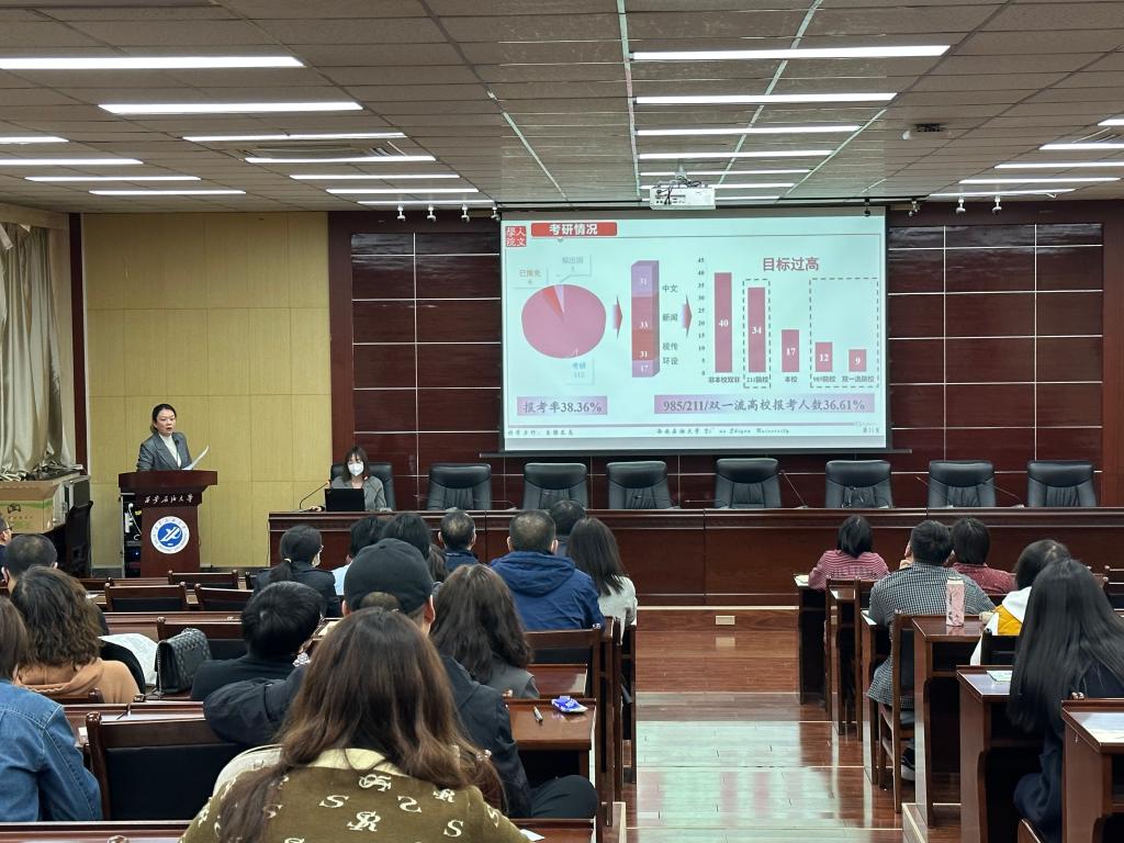 盛丹向全院宣讀了《人文學院關于表彰2022屆畢業生就業工作先進個人的決定》,余小勇、李濤、方松林為獲獎教師頒發榮譽證書。隨后,盛丹就2023屆畢業生基本情況、就業進度、考研報名及初試情況匯報了2023屆畢業生就業工作進展。她指出,目前2023屆畢業生就業形勢依然十分嚴峻,不容樂觀。她向全體教職工匯報了已開展工作、目前面臨的難點和下一步計劃,強調畢業生就業工作需要全院教師共同參與,形成合力,要千方百計教育畢業生樹立正確就業觀、擇業觀,想方設法推進學生想就業、能就業、快就業。