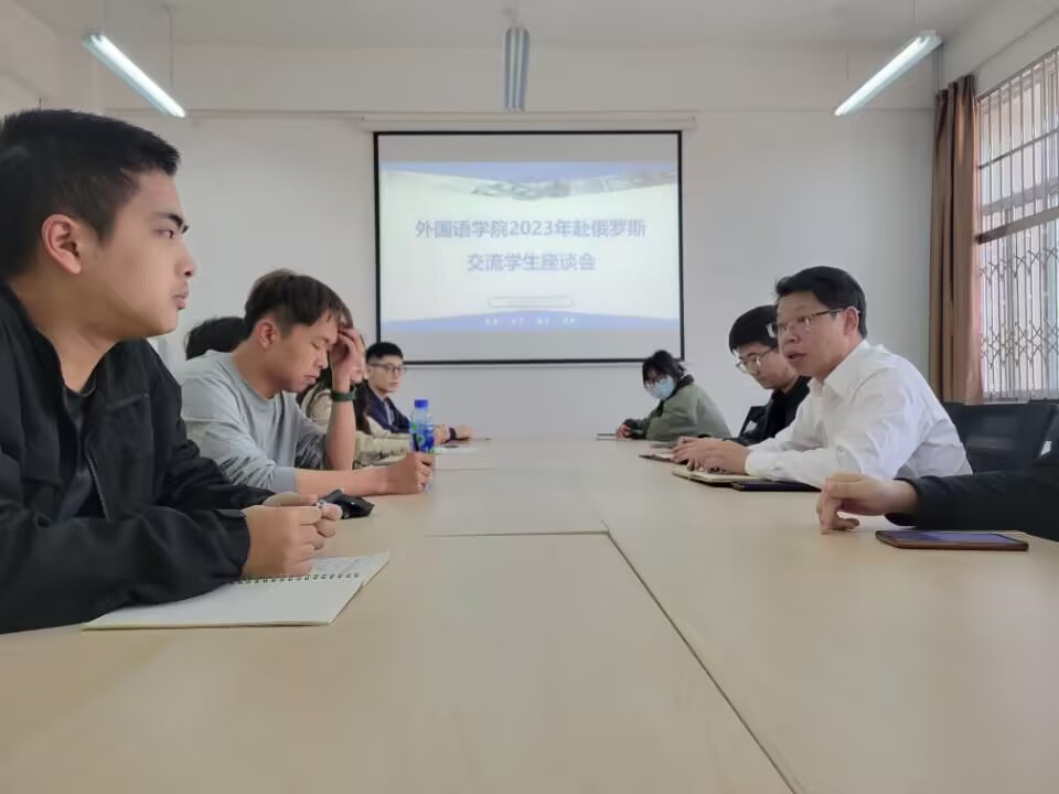 為增進同出國交留學生的溝通與交流,了解學生出國前的準備與學業生涯規劃情況,加強學生的思想政治教育與安全教育引導,3月9日上午,外國語學院2023年赴俄羅斯交流學生座談會在崇文樓314舉行。學院黨委副書記王業青,2020級輔導員陳浩參加座談會,同即將出國的同學進行了深入的交流。