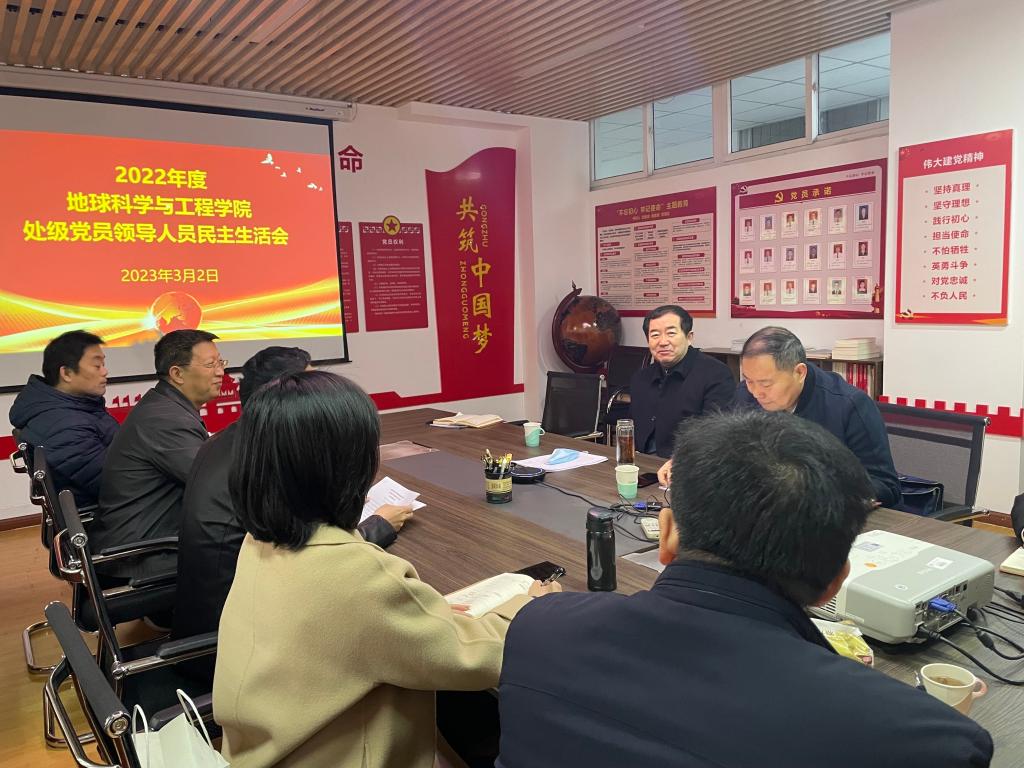 2023年3月2日上午,地球科學與工程學院在雁塔校區一號實驗樓207黨員活動室召開2022年度處級黨員領導人員民主生活會。校長李天太,學校民主生活會指導組第二組組長、校紀委副書記齊仲鋒到會指導。會議由學院黨委書記馬行天主持,地球科學與工程學院全體班子成員參加。
