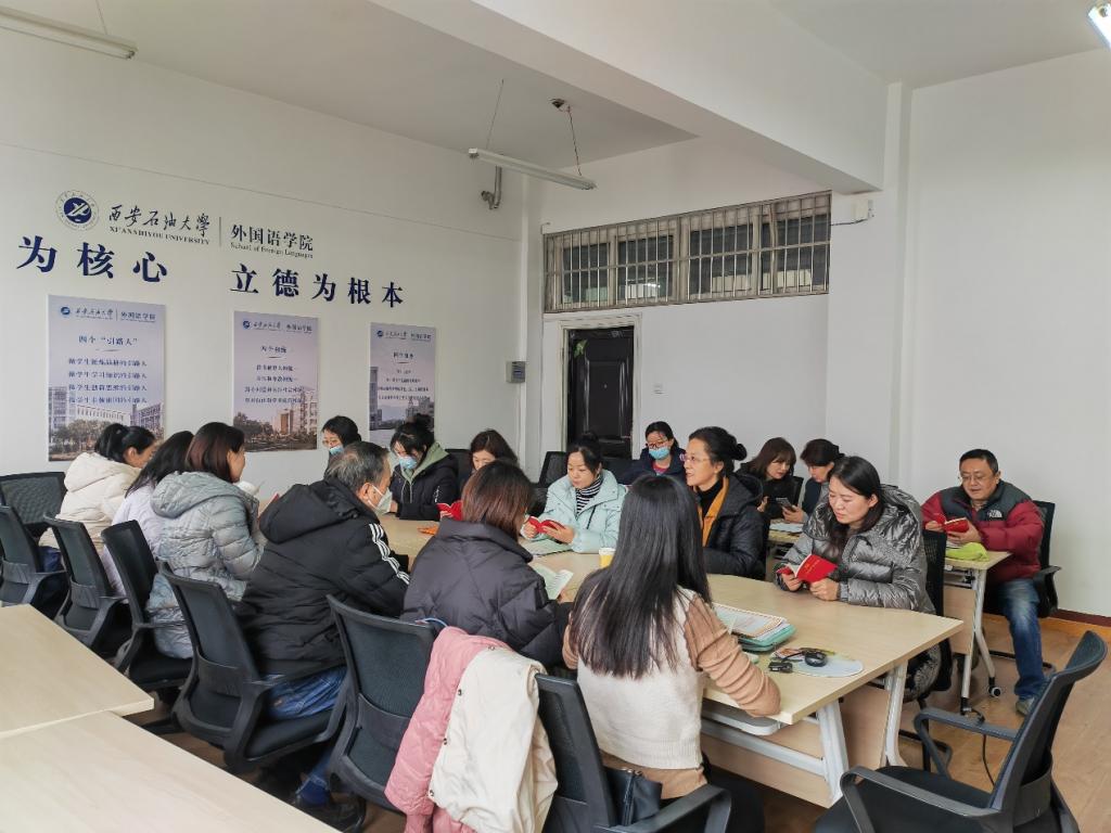 2月22日下午2:00,外國語學院大學外語第一教學部黨支部在雁塔校區華油能源樓706室召開師德師風法規專題學習會議,會議由黨支部書記付俊芳主持,大學外語第一教學部全體黨員教師參加會議。