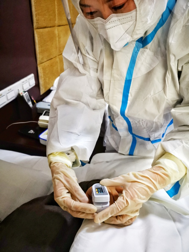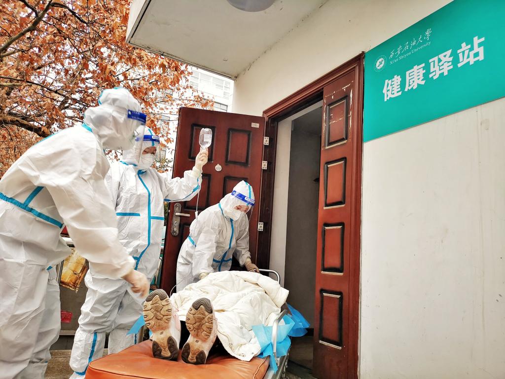 本次活動以健康驛站的一名新冠病毒肺炎患者突發身體嚴重不適的情況為演練場景。驛站工作人員接到求救信息后立即報告驛站工作專班負責人,救治小組攜帶制氧機、血氧儀和AED等設備迅速到達現場,通過對患者體溫、血壓、脈搏、血氧飽和度等檢查快速判斷患者的生命體征,在撥打120救助后,立即開展心肺復蘇、電除顫、給氧、施針搶救等操作。經醫護人員的搶救后,患者生命特征趨于好轉并第一時間交校外120救護車轉運至定點醫院進行繼續救治。