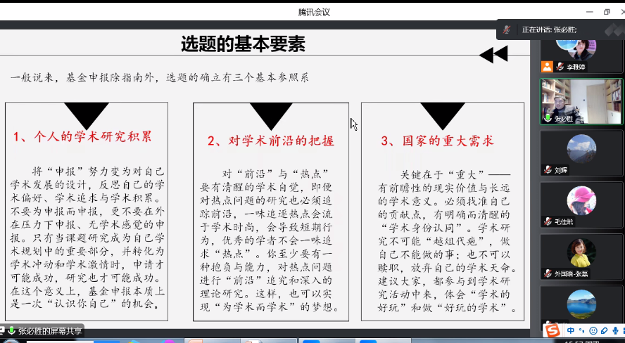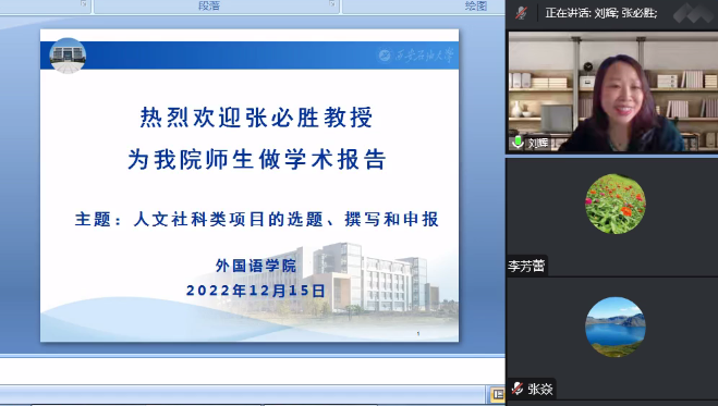 為進一步做好人文社科基金項目申報組織工作,提高國家社科基金項目及其他基金項目的申報質量,外國語學院于12月15日下午15:30,特別邀請貴州師范大學教授、博士生導師張必勝教授開展了題為“人文社科類項目的選題、撰寫和發表”的線上專題講座。外國語學院全體教師、全體翻譯碩士研究生共200余人在線參加了本次講座,講座由劉輝副院長主持。