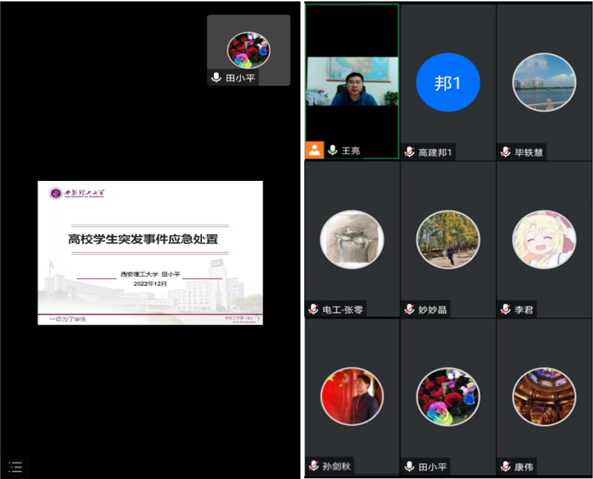 為深入貫徹全國高校思想政治教育工作會議精神,落實《西安石油大學“卓越”輔導員素質能力提升計劃》,進一步提升我校輔導員應急處突能力,按照2022年輔導員專題培訓工作安排,12月16日,學生工作部組織全校學工干部在騰訊會議上開展2022年輔導員專題培訓第五講“高校學生突發事件應急處置”。培訓由西安理工大學學生工作部、研究生工作部、武裝部部長田小平主講,我校學生工作部部長王亮主持。
