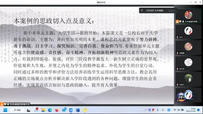 政治理論學習會后,大學外語第二教學部黨支部召開全體黨員大會。集體學習了《中國共產黨第二十次全國代表大會報告》。會議強調,學習宣傳貫徹黨的二十大精神是今后一個時期的首要政治任務,支部全體黨員要提高思想認識,切實增強學習的自覺性和堅定性,積極參加學院黨委“學習二十大,奮進新征程”黨的二十大精神知識競賽活動,確保學有成效。隨后,沈舒方和畢瑩兩位黨員教師從教學目標的思政建設設置、課堂活動的引導、課外活動的促進、將思政建設活動與專業教育進行雙融合等方面進行了課程思政案例分享。