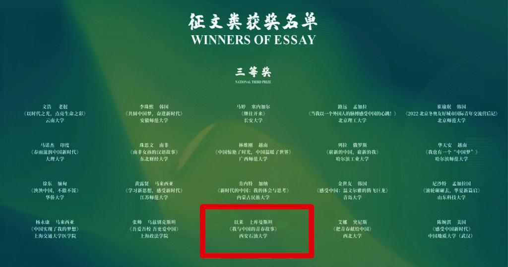 2022年11月,由中共中央對外聯絡部《當代世界》雜志社與中國新華新聞電視網等聯合主辦,國家留學基金管理委員會秘書處協辦的“感受中國新時代”主題征文、攝影和短視頻大獎賽獲獎結果公布,并在北京舉辦了線上線下頒獎儀式。我校土庫曼斯坦籍留學生以萊的作品《我與中國的青春故事》榮獲征文類全國三等獎。