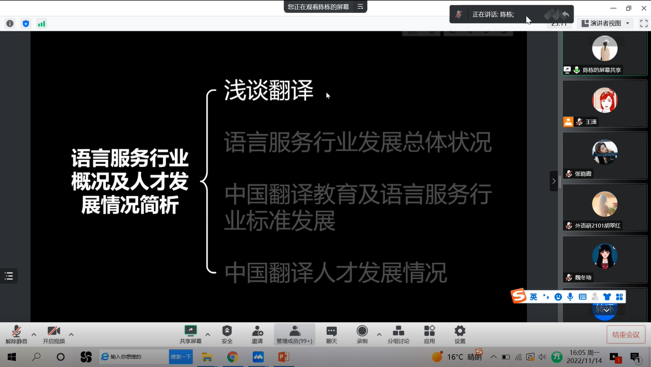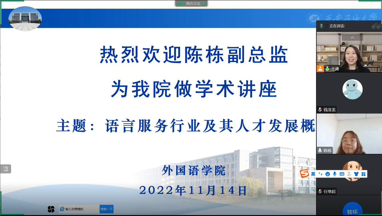 為進一步做好2023屆畢業生就業創業工作,加強學生就業指導,強化就業育人實效,提高翻譯碩士研究生的職業素養,幫助學生了解語言服務行業的基本現狀,引導學生從實際出發選擇職業和崗位,做好職業規劃。11月14日下午,外國語學院邀請中譯語通(陜西)科技有限公司語言服務事業群陳棟副總監,為我校MTI全體研究生作題為“語言服務行業及其發展概況”的線上專題講座。外國語學院MTI全體研究生100余人參加講座,講座由副院長劉輝主持。