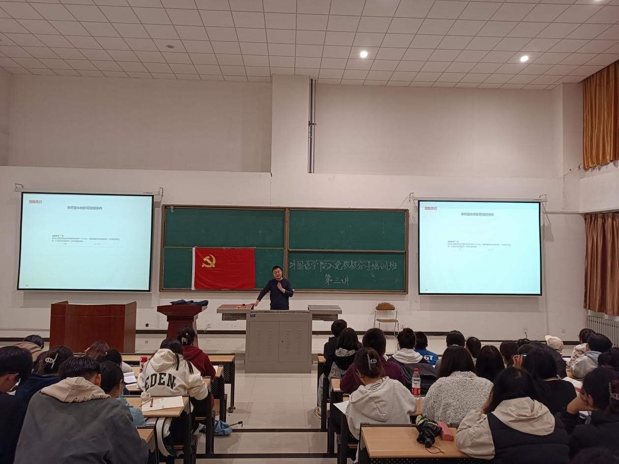 為進一步提升學院入黨積極分子的理論素養、思想覺悟,聚焦青年思想,引導青年骨干堅定信念跟黨走,勇做走在新時代、新征程上的奮進者。11月10日,外國語學院在鄠邑校區石工地科樓115教室舉行第十一期入黨積極分子培訓班第三次集中授課。校團委書記何國強為2022年入黨積極分子授課。