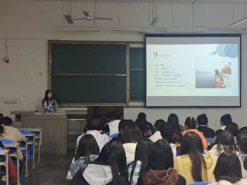 辛怡萱同學向同學們詳細講解了保研推免的資格獲取要求,以及多種保研方法,很詳細地將準備資料、院校面試、確定錄取各個時間段中的問題進行解釋,期間不斷回應同學們的疑惑。希望同學們懂得利用學校資源,從而彌補自己的不足。最后她特別強調了設計類專業英語四級的重要性,并將自己學習四級的應試技巧進行了分享。