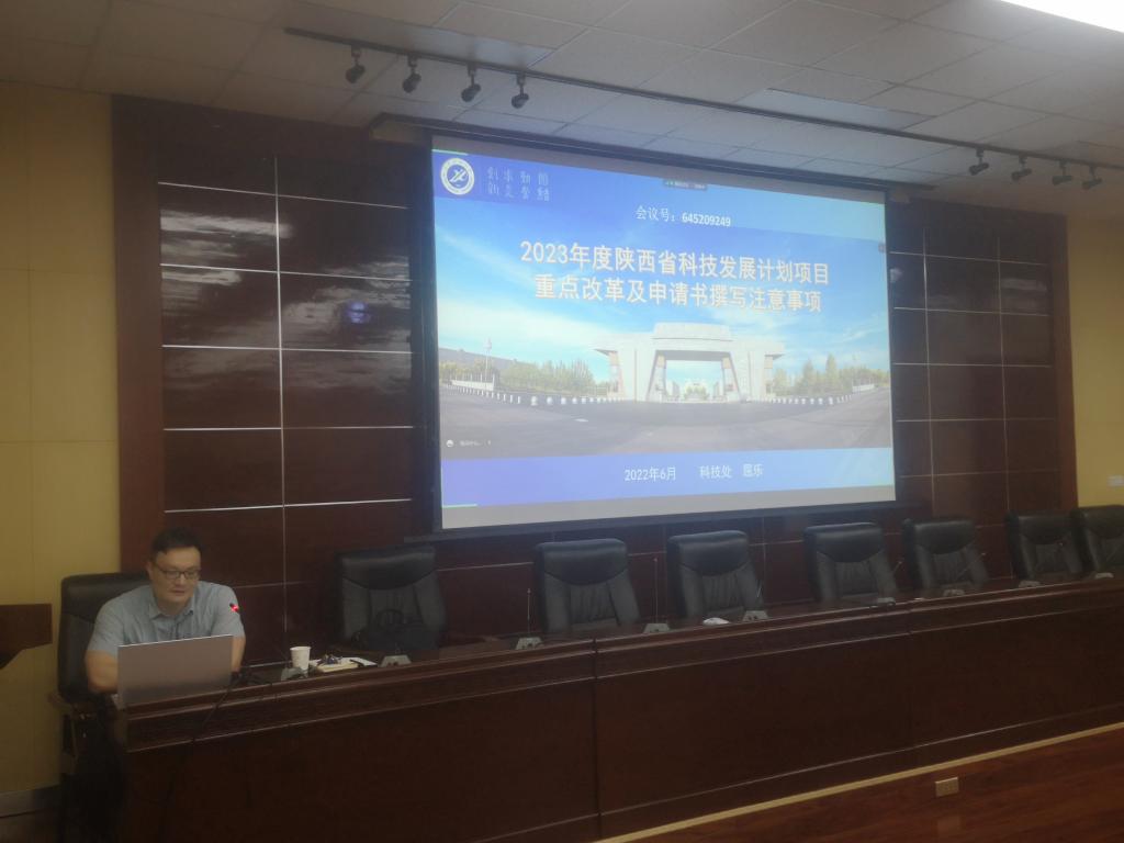 6月7日下午,科技處在雁塔校區第五會議室召開2023年度陜西省科技發展計劃項目申報培訓會,會議采取線上線下同步進行,各院(系)主管科研工作負責人、科研秘書及教師代表參加了會議??萍继幐碧庨L丁昌峰主持會議。