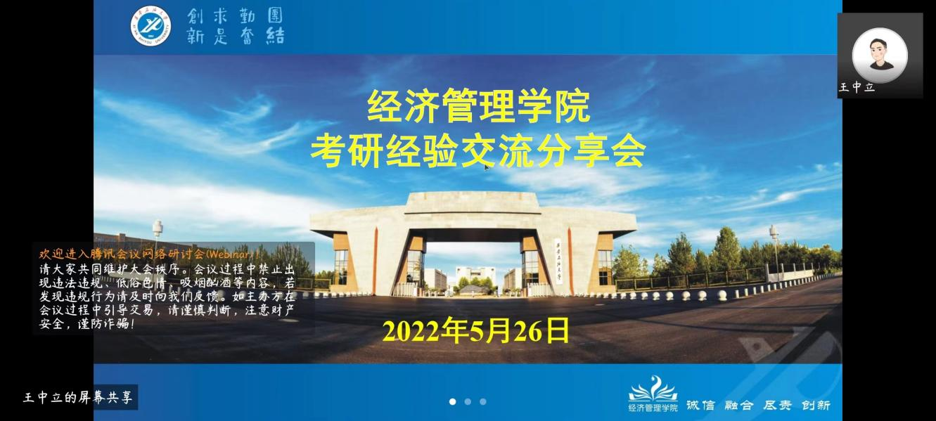 為拓寬學生未來規劃發展視野,激發學生考研積極性與主動性,幫助學生樹立明確目標、把握備考節奏、調整復習心態,經濟管理學院于5月26日利用騰訊會議線上舉辦了“考研經驗交流分享會”。本次會議邀請了被首都經濟貿易大學、華東政法大學、英國南安普頓大學、美國克拉克大學等國內外知名院校錄取的18位學院2018級優秀考研畢業生代表進行經驗交流分享。學院2019級和2020級輔導員及學生代表參加會議,會議由輔導員王中立主持。