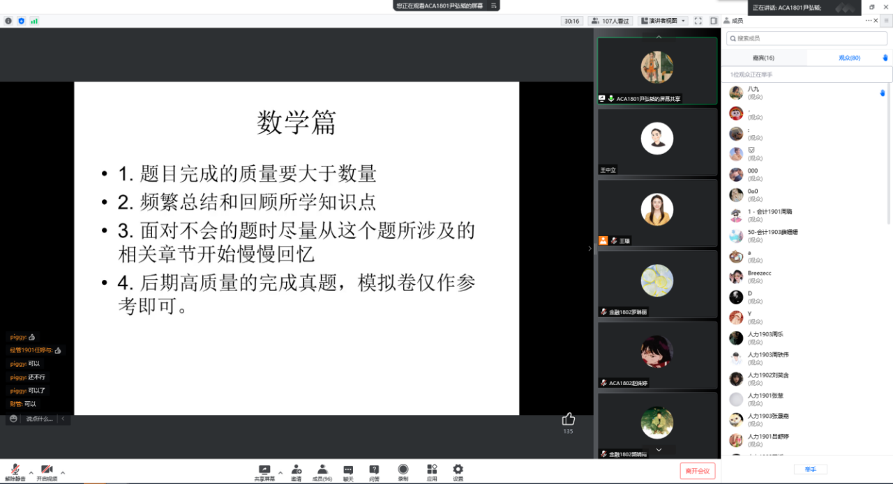 會議首先由輔導員王中立進行考研動員介紹,就當前畢業生所面臨的考研形勢進行分析,并鼓勵大家堅定考研信心,科學選擇目標,潛心復習備考,爭取順利上岸。18位優秀考研畢業生代表依次進行經驗分享,他們從自身考研經歷出發,圍繞如何選取院校專業、制定復習計劃、調整備考心態以及復試中的注意事項等方面進行交流,并著重介紹了考研英語和數學科目的學科特點、知識難點、考試重點、復習要點,并建議大家在備考途中要以堅持不懈的恒心、持之以恒的耐心、百折不撓的信心去面對挫折與挑戰,要培養總結知識的歸納能力,對待錯題、難題、偏題要及時進行分類整理與鞏固,日積月累、有效提高。輔導員王璟和王中立對本次考研經驗交流分享會表示肯定與支持,同時強調備考同學要以充足的信心、飽滿的熱情、科學的方法、合理的計劃對待艱苦奮斗的考研之路,相信大家通過努力終將實現夢想。