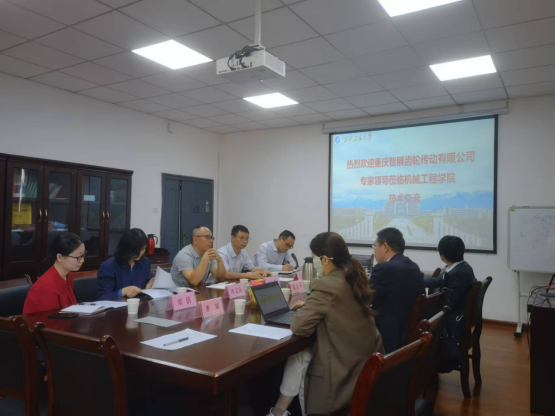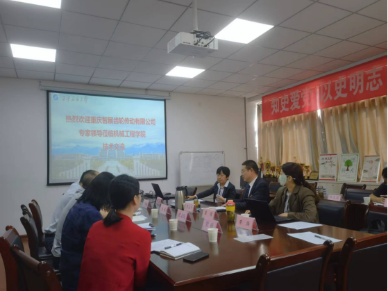 竇益華院長首先對何榮校友一行來校表示熱烈歡迎,并詳細說明了學院組織架構和科研業績,重點舉例近兩年與企業戰略合作成果。何榮校友代表智展齒輪介紹了公司的發展歷程,列舉了所取得的多項國內領先技術成果,以及公司的發展方向。學院副院長崔璐重點介紹學院在機械傳動、故障診斷、疲勞損傷、傳質傳熱等方向的研究進展,以及與西安交通大學、西北工業大學等院校合作開發成果。智展公司江師露主任則展示了公司的主要產品及應用案例,并且提出部分待解決的技術難題。陳兵教授當場對公司提出的部分問題進行了初步分析,并且與幾位年輕教師一起展開討論,與來訪技術專家就高速齒輪箱傳動和常見故障進行了深入交流。