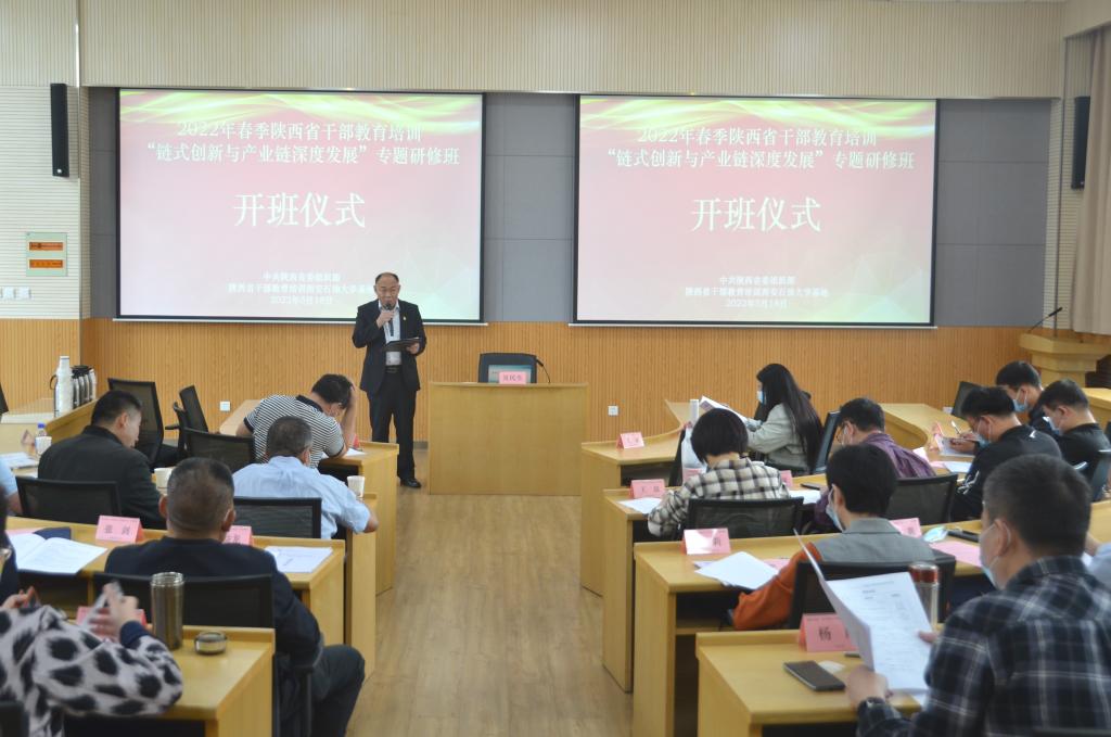 2022年5月18日上午,由省委組織部主辦、我校干訓基地承辦的2022年春季陜西省干部教育培訓“鏈式創新與產業鏈深度發展”專題研修班,在我校明德校區培訓中心順利開班。繼續教育學院副院長吳民生出席開班儀式并致歡迎辭,來自省市黨政機關的50余名領導干部參加了開班儀式。儀式由班主任康高梅子主持。