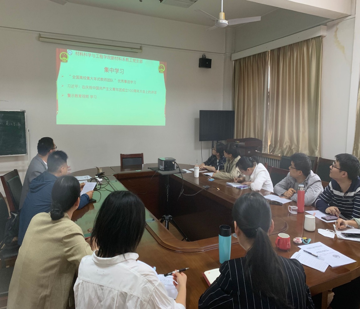 5月13日,材料科學與工程學院新材料系教工黨支部全體黨員在雁塔校區四號實驗樓312會議室召開了黨員大會,開展了專題學習研討活動。深入學習陜西省“全國高校黃大年式教師團隊”先進事跡,習近平總書記在慶祝中國共產主義青年團成立100周年大會上的重要講話。會議由支部書記王磊主持,新材料系全體教師參加會議。
