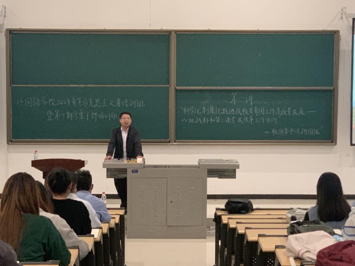 為進一步加強學生干部隊伍的建設,筑牢意識形態陣地,充分發揮學生干部在大學生思想政治教育中的橋梁和紐帶作用,提高學生干部的政治素質、理論水平和業務能力,提升學院育人水平和人才培養質量。5月10日,外國語學院在石工地科樓115舉辦2022年青年馬克思主義者培訓班暨第十期學生干部培訓班。邀請學校團委書記何國強擔任主講老師,學院黨委副書記王業青做了開班儀式動員,活動由學院輔導員陳浩主持。