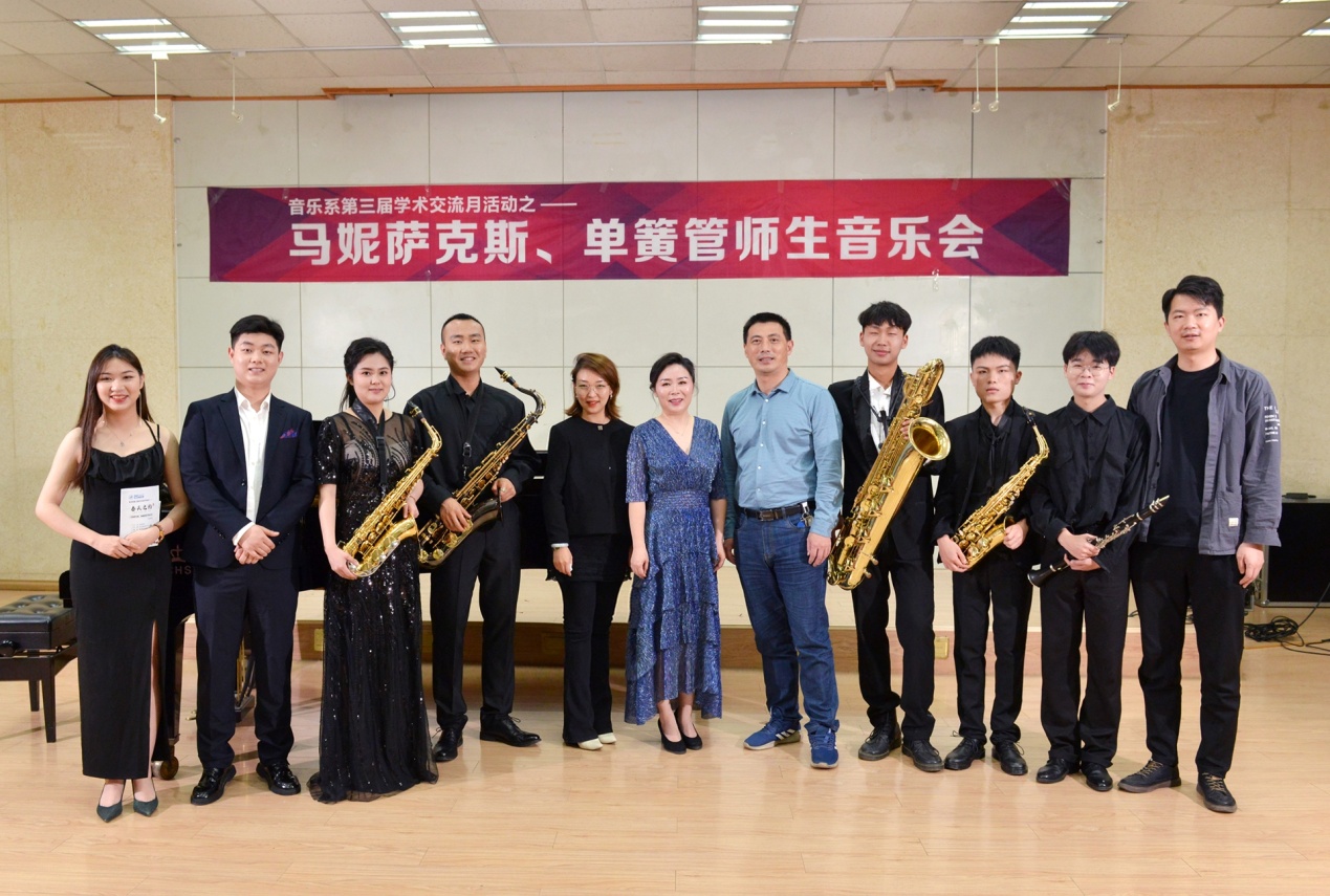 音樂會首先由學生蘭志鵬、曹之瑜、段紹德、胡盈盈用薩克斯和單簧管分別演奏了:《沙龍舞曲》、《柔板與快板》、《夏日》、《西班牙主題與變奏》、《思鄉曲》和《原創主題幻想曲》等樂曲。學生技術嫻熟,表現力豐富,得到了現場觀眾的陣陣掌聲。音樂會最后由馬妮老師演奏了中央音樂學院單簧管教授張梧先生創作的《蘇北調變奏曲》及皮亞佐拉的《Night Club 1960》將音樂會推向了高潮。音樂會在全體師生合奏的《龍貓》旋律中圓滿結束,音樂會得到了現場及騰訊會議觀眾的一致好評。