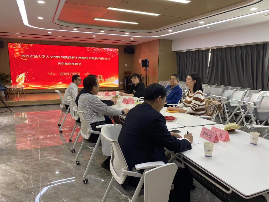 4月27日下午,西安石油大學人文學院書記余小勇、副書記盛丹、學辦主任付強、畢業班輔導員李嶠一行受邀走訪了陜西新才網絡技術股份有限公司。雙方就人才培養、專業建設、實習就業等內容展開了深入座談研討。