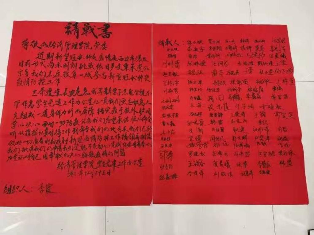 經濟管理學院團委發表請戰書,團學干部秉承“疫情面前顯擔當,越是困難越向前”的精神,主動請戰深入抗疫一線,時刻準備著為堅決打贏抗擊疫情戰斗勝利貢獻自己的一份青春力量!那一聲聲蕩氣回腸的請戰聲,此刻便是戰勝疫情的凱歌,正是有了他們的勇于擔當,才更加堅定了我們戰勝疫情的信心。