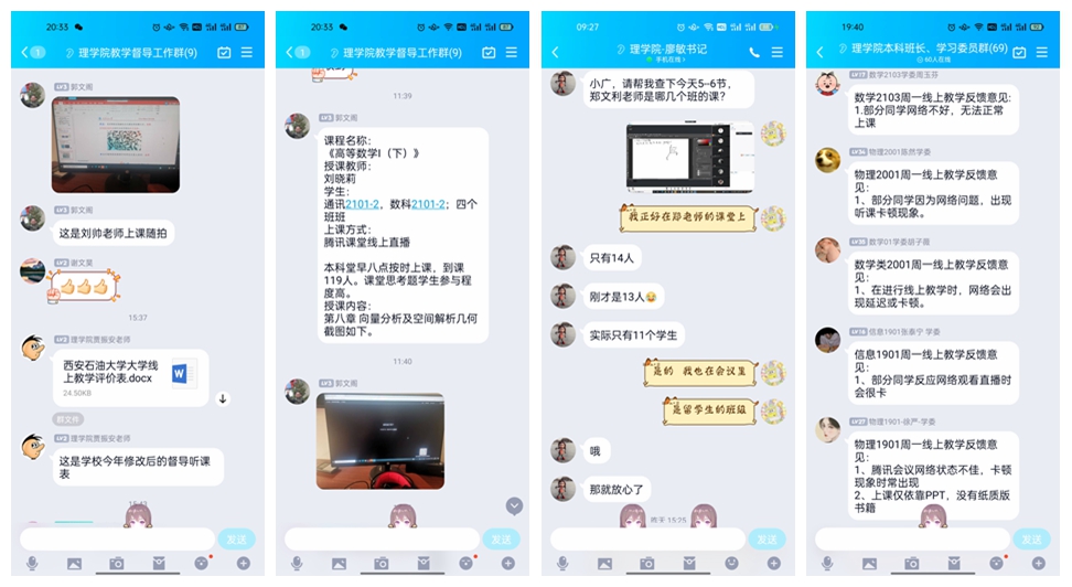 多渠道反饋,全方位總結,切實保障線上教學質量。線上授課開始前,教學辦公室提前收集匯總開學第一天的授課平臺及班級邀請碼,邀請學院領導及校、院兩級教學督導,深入線上課堂,聽取授課情況,并實時反饋。上課結束后,及時收集各年級同學對線上授課的意見和建議,第一時間了解線上教學運行情況,總結線上教學遇到的問題,積極與教務處溝通協調,為師生營造一個良好的線上教學環境。