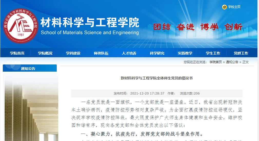 12月20日,材料科學與工程學院黨委第一時間發出《致材料科學與工程學院全體師生黨員的倡議書》,號召廣大黨員要迅速投入到疫情防控工作中來,率先垂范、擔當使命,沖在最前、干在最前,用實際行動傳遞黨的聲音,凝聚黨的力量。在這樣的號召下,一個個材料人爭當抗“疫”先鋒,用一個個弱小的力量慢慢匯聚到這場疫情阻擊戰的大戰役中。
