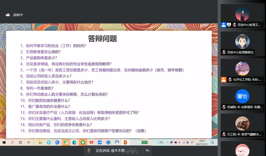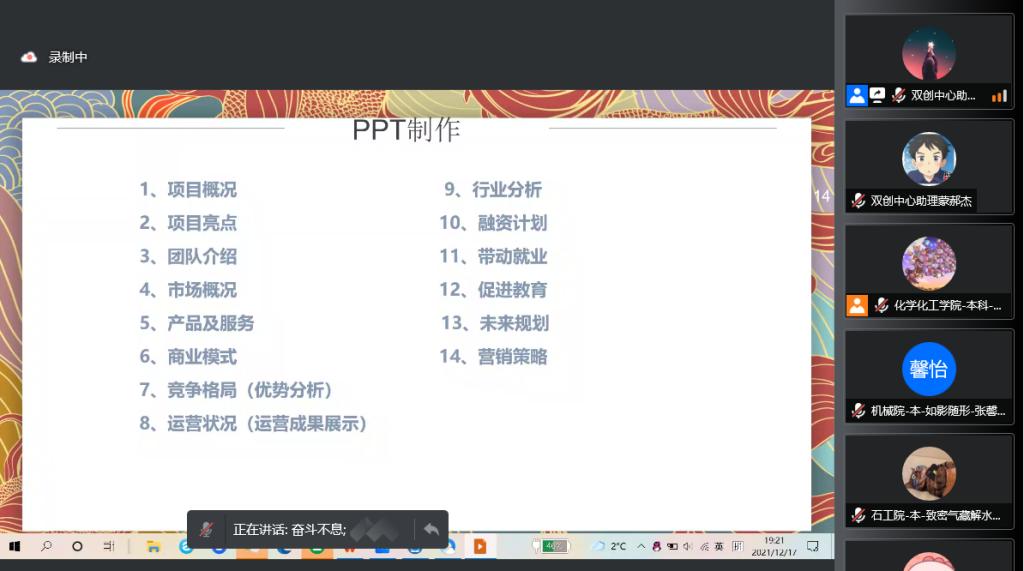 12月17日晚,由創新創業中心主辦的西安石油大學2021年大學生創新創業訓練營第八講順利開課。本次課程以《路演技巧和流程》為主題,訓練營全體學員參加了本期課程。