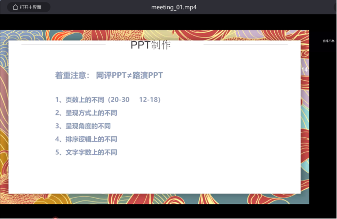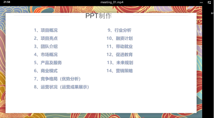 劉老師將大賽PPT的制作分為十四個板塊,并從市場分析、項目亮點、產品及服務、商業模式、團隊協作、優勢分析、運營成果展示、營銷策略等部分進行了全面且詳細的介紹與闡述,向學員們講解了各版塊的具體內容及要點細則。為了讓學員們更好的理解什么樣的PPT是優秀的,劉老師對往屆“互聯網+”大賽的路演PPT進行了分析,并指出其中的優點與不足,便于學員們具體形象地理解,加深學員們的印象。