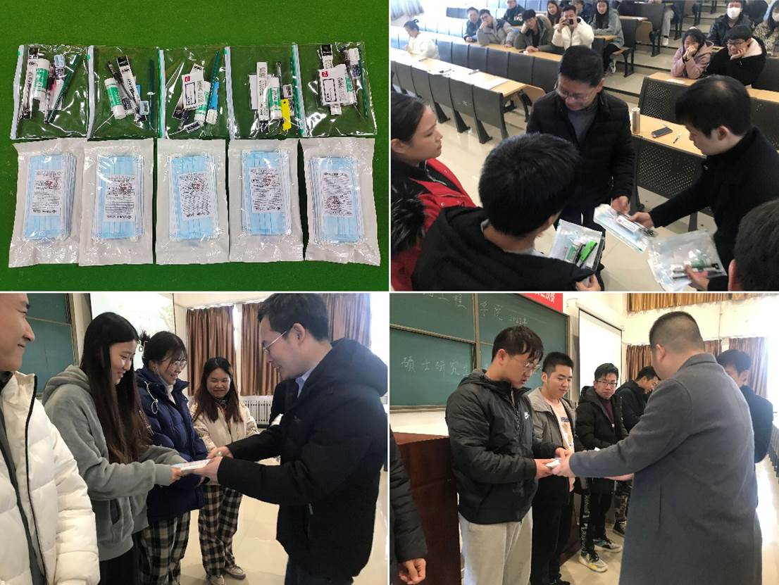 馬勇書記、張建高副書記和朱戰威主任還為學生代表發放了愛心加油包并合影留念。老師們將承載著學院愛心與期盼的加油包親自遞到學生的手上,同時送出祝福,增強了考研學子的信心,禮包雖小,愛心無價。