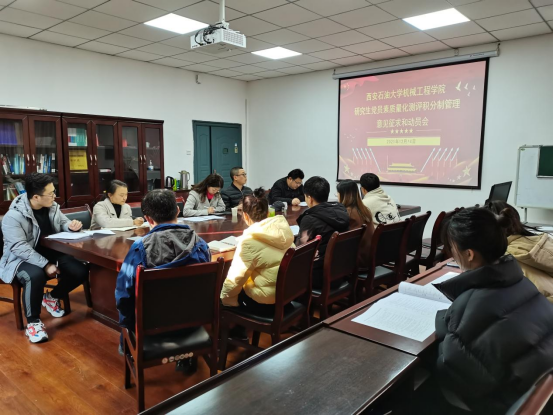 首先,研究生輔導員歐紅娟宣讀了《機械工程學院研究生黨員素質量化測評積分制管理實施辦法(試行)》,并就該辦法及指標體系從指導思想、組織保障、測評內容、操作流程等方面匯報,就動力(思政素質)、活力(模范帶頭)、潛力(學習情況)、壓力(紀律規矩)、魅力(先鋒示范)“五力”指標體系進行了重點介紹。