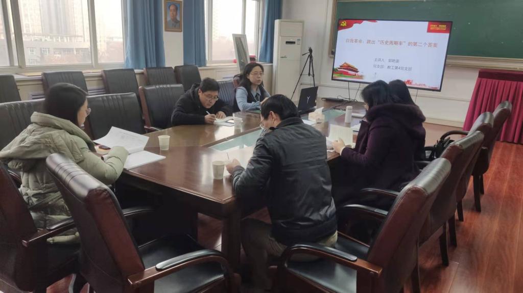 會議第一階段由黨支部書記郭艷英結合黨的十九屆六中全會精神,作了題為《自我革命:跳出“歷史周期率”的第二個答案》的黨課講授。郭老師從自我革命是黨百年奮斗的歷史經驗、勇于自我革命是馬克思主義政黨獨有的政治品格、以新時代黨的自我革命引領新的偉大社會革命三個方面進行了講述。