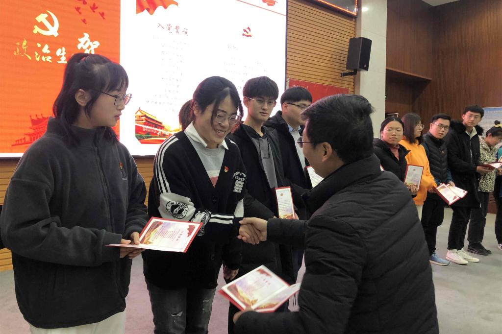 本次“政治生日”儀式在《國際歌》的歌聲中拉開序幕,朱戰威老師為本次政治生日會致辭,向今天參加“政治生日”的全體黨員表示祝福,他希望全體黨員牢記自己的政治生日,時刻警醒自己,對黨忠誠,不忘入黨初心、牢記入黨使命。黨員代表王志超、預備黨員代表陳科棋,先后宣讀了自己的入黨志愿書并作表態發言,號召廣大青年愛國愛黨,不忘初心、牢記使命,為實現中華民族的偉大復興而努力奮斗。