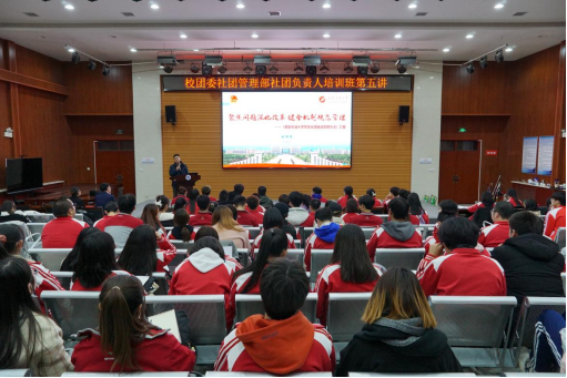 為提高學生社團負責人綜合能力素質,扎實推進我校學生社團全面、規范、健康發展,11月30日晚,校團委在就業指導中心多功能廳舉辦學生社團負責人培訓班第五講,全校各學生社團負責人和校團委社團管理部全體人員參加培訓。