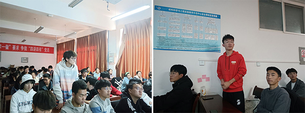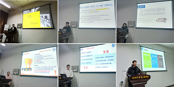 材物1901班陳瀟瀟從學習時間安排、不同時間段的學習計劃等方面,介紹了高效學習方法,并向所有班委同學傳授了兼顧學習和班級管理工作的寶貴經驗,為班委明確學習和工作目標,樹立了良好的榜樣。材物1801班李思瀾現已保研成功,她以自己的親身經歷為能材21級學生介紹了考研和保研的經驗,并強調大學學習中積極參加競賽和科研項目的重要性。材物1801班胡騰介紹了自己的學習經歷,提醒同學們要珍惜時間,把握當下,強化自我管理能力,為自己的夢想去拼搏。