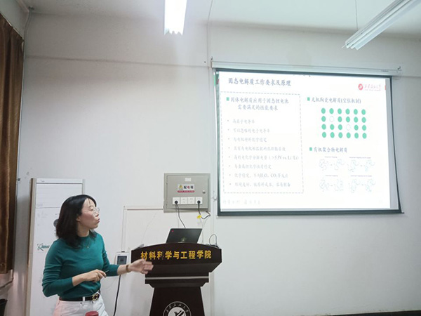 接下來,畢佳穎老師從鋰離子電池的發展和突出問題入手,指出發展固態鋰電池的重要意義。畢老師從固態鋰電池的概述、研究背景、面臨的挑戰和固態鋰電池的技術展望等四個方面,深入淺出地介紹了固態鋰電池安全性以及科研工作者在此項工作中所做的卓越研究。在講到固態鋰電池的應用前景時,畢老師通過我國深海設備的實例出發,介紹了固態鋰電池在高水壓環境中的突出性能。學生們根據畢老師的精彩報告,踴躍發言提問,活動現場氣氛熱烈。本次系列講座增強了學生的專業認同感和自豪感,同時激發了學生努力學習專業知識,投身國家能源發展大潮的熱情。