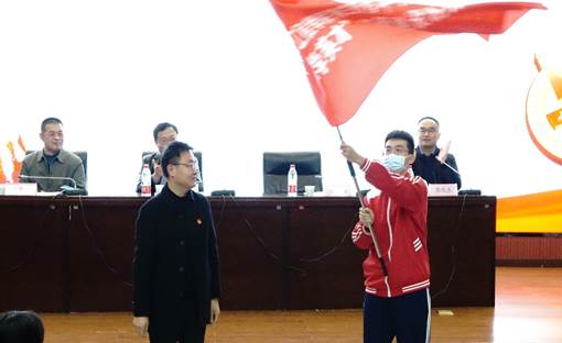 校團委書記何國強向學員代表授班旗,這標志著班級有著共同的價值認同,將旗幟舉過頭頂,將責任擔在肩上。