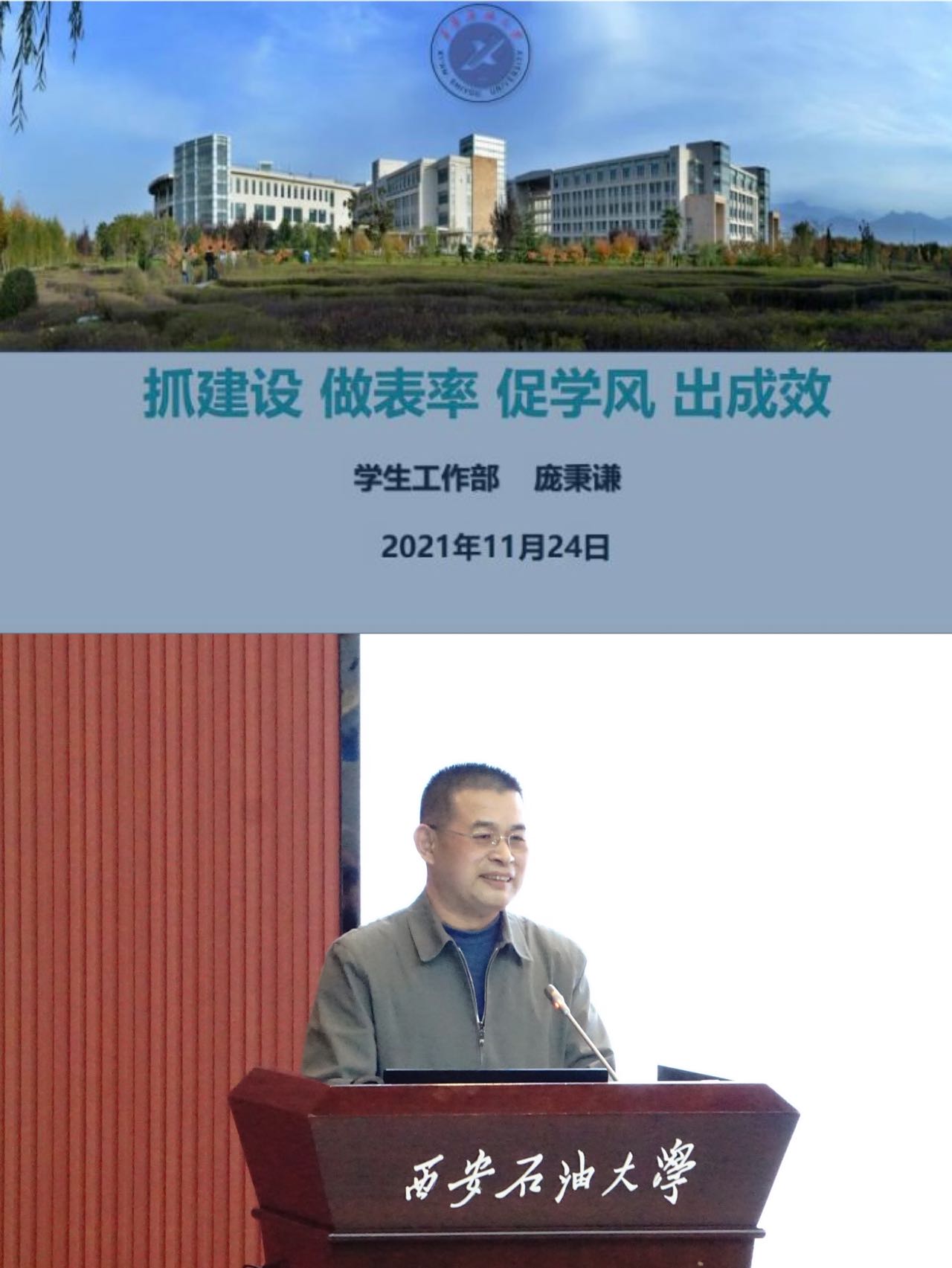 隨后,校學工部副部長龐秉謙為全體學員做了題為《抓建設 做表率 促學風 出成效》的開班第一講。龐秉謙副部長分別從加強班級建設的重要性和必要性;如何做好班級建設工作;如何做一名優秀的班級學生干部三個方面向全體學員做了高站位、高質量的專題理論教學。尤其是在如何做一名優秀的班級學生干部方面,龐秉謙副部長更是結合自己的學生工作經驗和學生干部經歷,深入淺出地引導學員們要把準學生干部的身份定位、正確處理學生干部的五個關系等方面做好具體工作,促進班級建設。最后他說道:“大家一定要傳承地科院的優良學風,認真學習,不斷完善自己,爭做一名優秀的學生、一名優秀的學生干部,做好班級建設相關工作。”