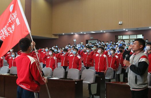 學生會主席靳興同學帶領全體學員面向班旗鄭重宣誓,要堅定正確的政治方向,全心全意為同學服務。