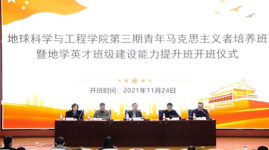 地球科學與工程學院第三期青年馬克思主義者培養班暨“地學英才”班級建設能力提升班開班儀式于11月24日下午在鄠邑校區弘石報告廳順利舉辦。學院黨委書記馬行天、校學工部副部長龐秉謙、校團委書記何國強、學院黨委副書記王瑩、學院全體輔導員及培訓班全體學員參加了開班儀式。儀式由學院學工辦主任李化杰主持。