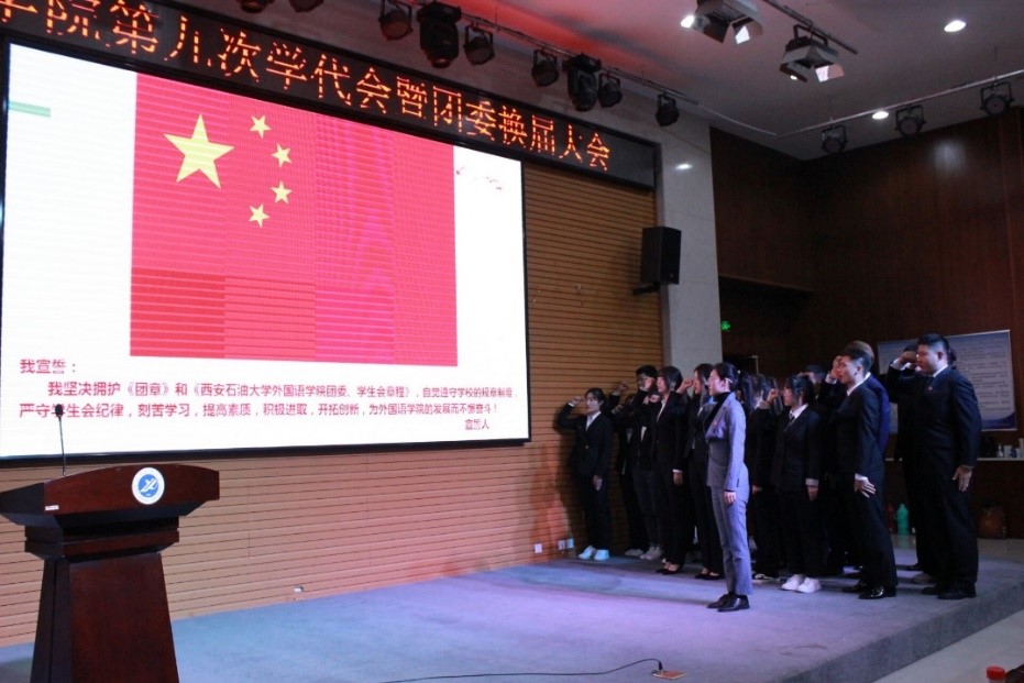 院第九屆學生會指導老師陶李宣讀了《西安石油大學外國語學院第九次學代會暨團委換屆大會選舉辦法》。隨后15位競選人進行競選演講,表達為學院團學工作貢獻力量的決心與熱情。最終,經過民主投票,差額選舉確定龐詩凡、徐子涵、睢佳等13位同學為外國語學院第九屆團委、學生會委員。陶李老師帶領當選委員進行宣誓。