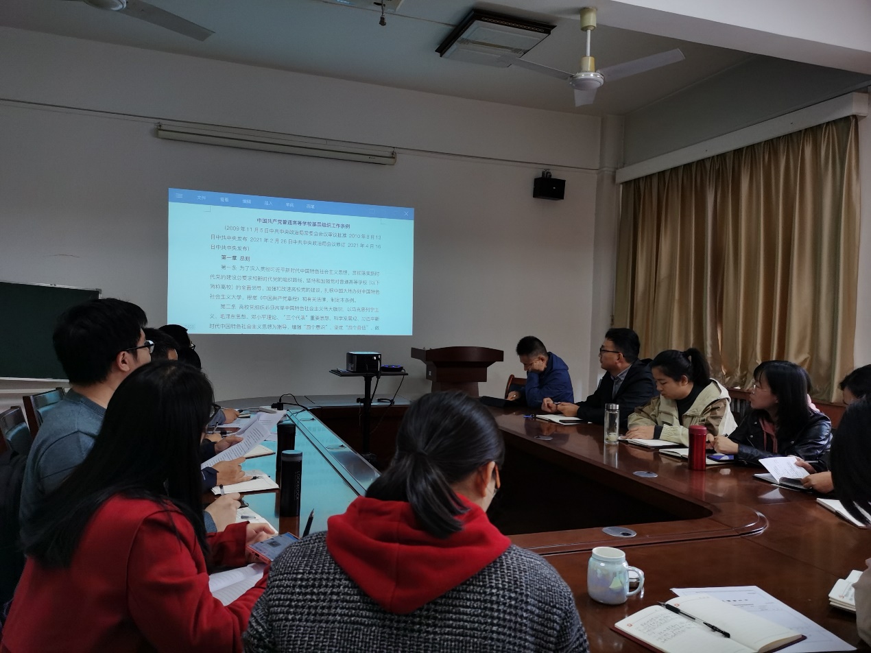 與會教師黨員通過接續閱讀和研討的方式深入學習了《中國共產黨普通高等學?;鶎咏M織工作條例》,深切領會了《條例》對于全面貫徹黨的教育方針,落實立德樹人根本任務,建設高質量教育體系、建設教育強國,具有重要意義。