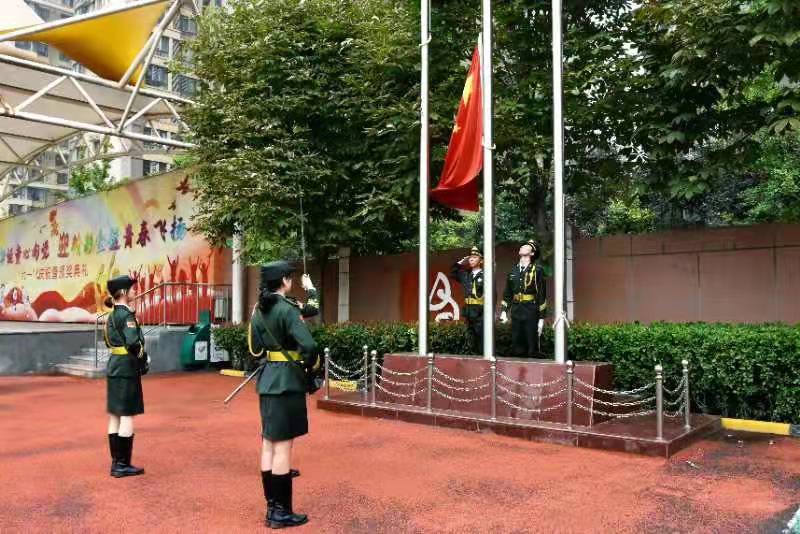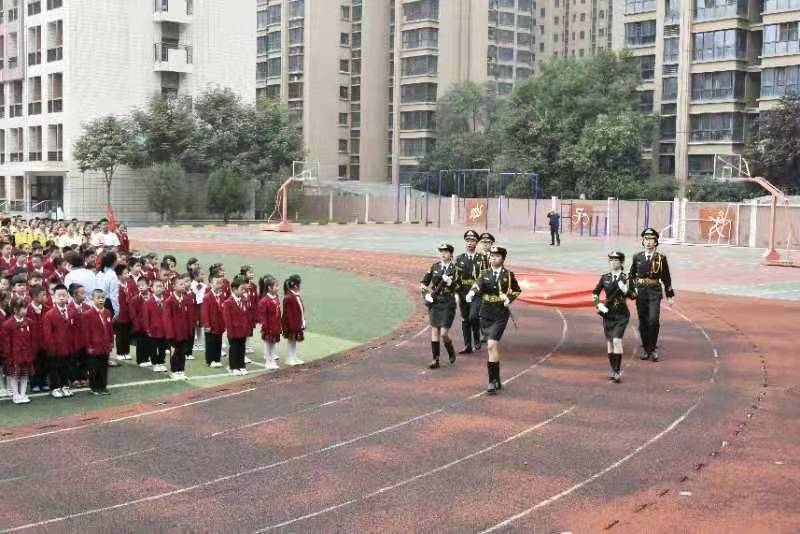 8時59分,在《中國少年先鋒隊出旗曲》伴奏下,大學生國旗護衛隊員身姿挺拔,步伐整齊,列隊出旗。9時整,國歌嘹亮,五星紅旗冉冉升起,1500名少先隊員身著整齊的校服,佩戴著鮮艷的紅領巾,行少先隊隊禮,其余未入隊一年級小學生行注目禮。