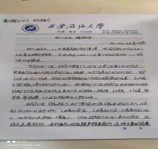 理想信念教育不僅是培養中國特色社會主義事業建設者和接班人的時代要求,更是實現中華民族偉大復興中國夢的迫切需要,大一新生理想信念教育是引導、激勵、凝聚大學生成長成才的重要抓手,是系好人生第一??圩拥年P鍵環節。我院新生理想信念教育以“鐵人精神”教育為主要切入點,在B區教學樓組織新生開展了《鐵人王進喜》的觀影活動,并積極組織撰寫了心得體會;黨委書記馬行天在鄠邑校區弘石報告廳為新生做了“堅定理想信息,做好大學規劃”的主題講座;黨委副書記王瑩在弘石報告廳向新生做了學校發展歷程和學院優良傳統的主題報告,經過理想信念教育,同學們逐漸明白要將小我融入祖國和人民的大我之中,才會更好的實現人生價值。