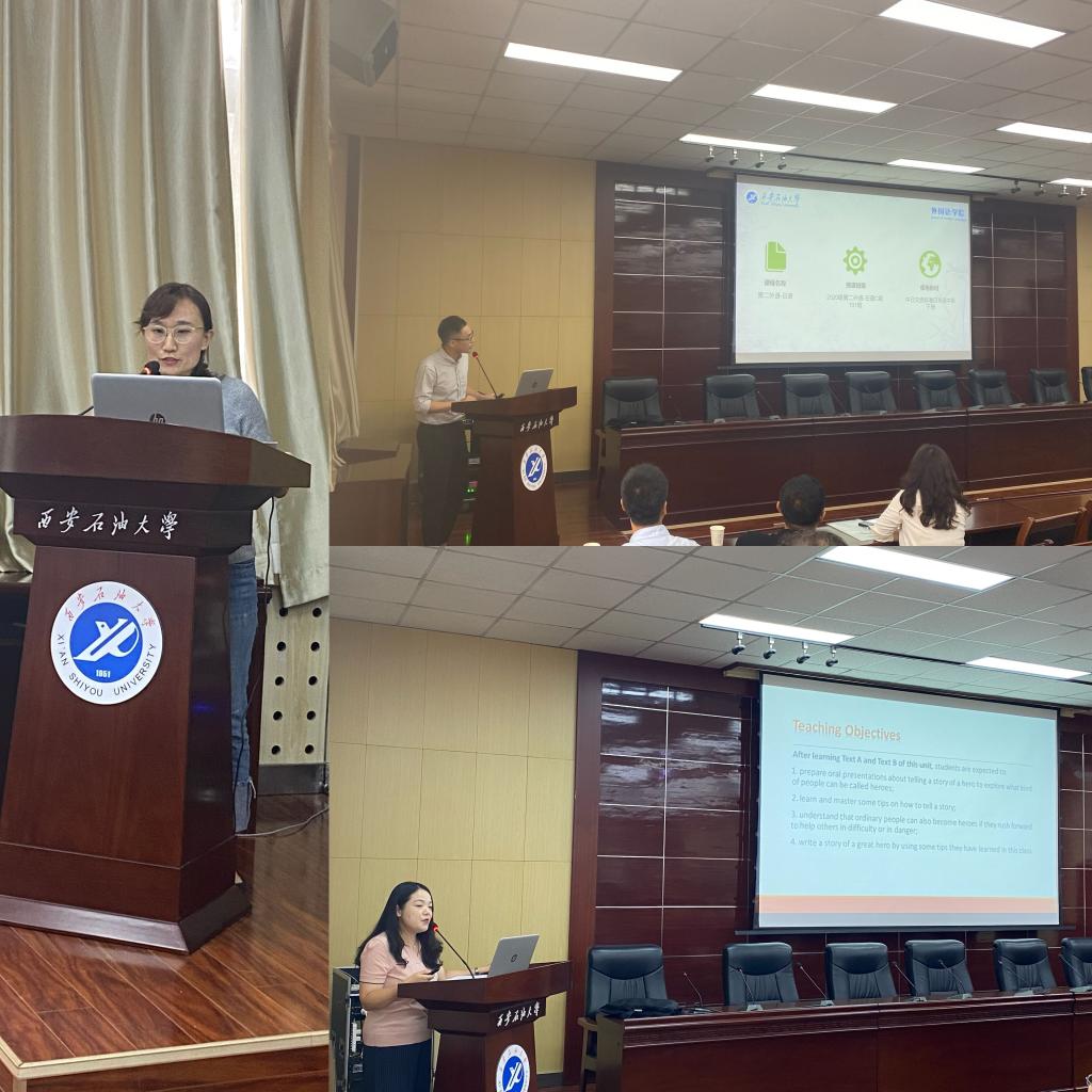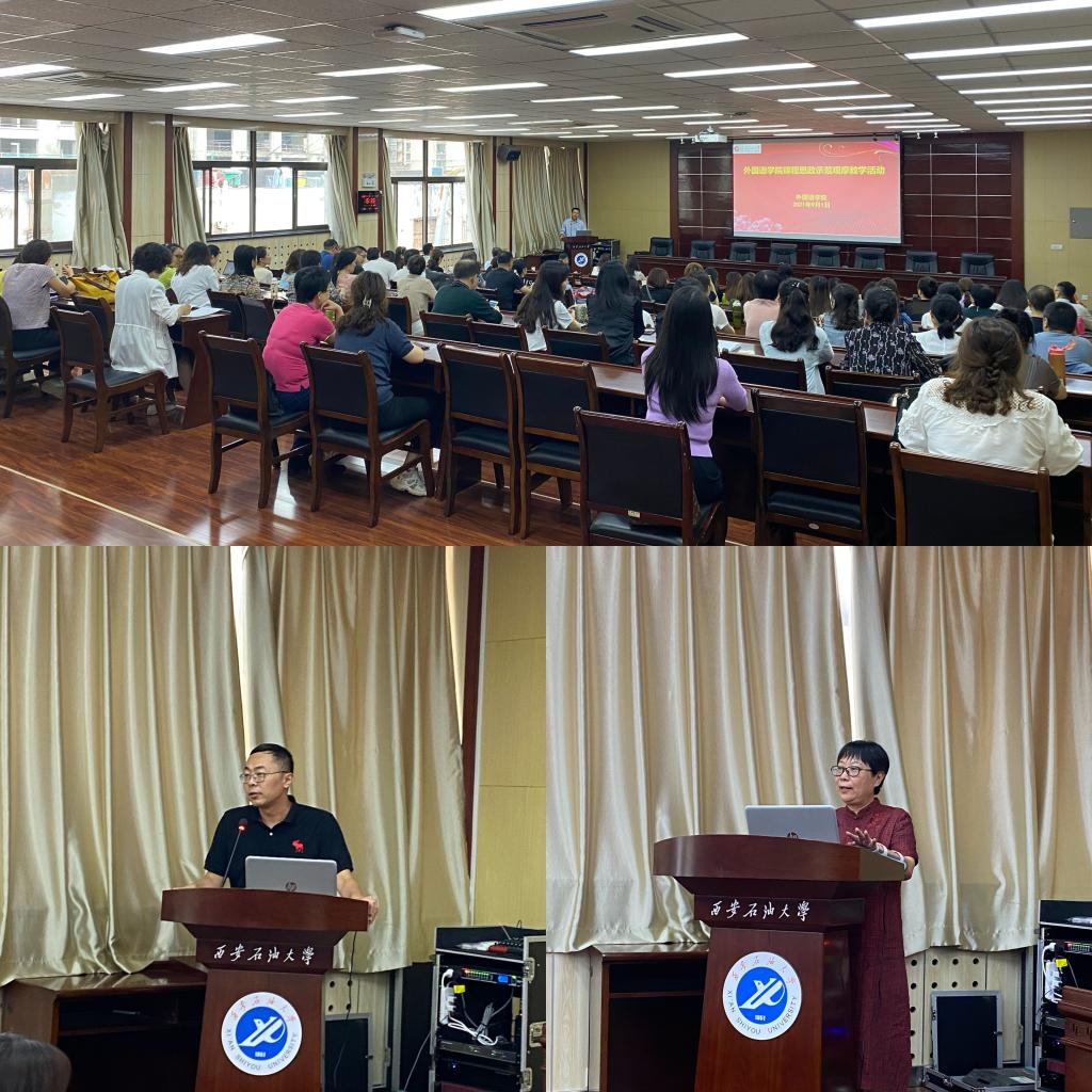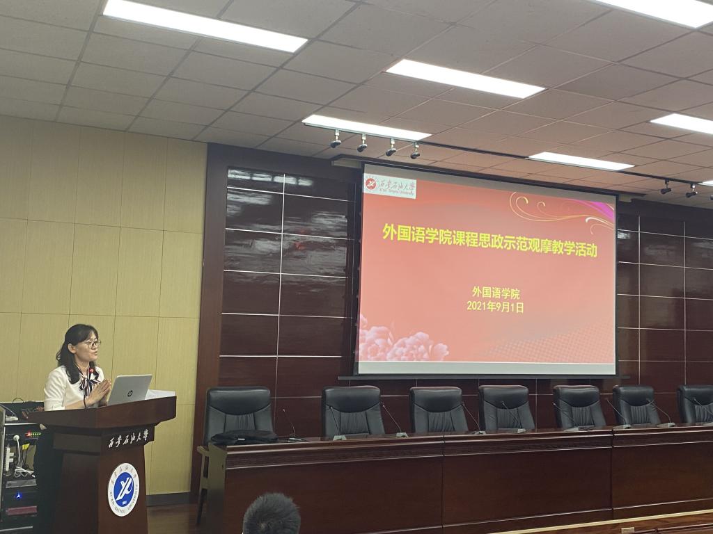 教學觀摩前,教務處副處長吳勛和外國語學院院長于艷英分別從國際形勢,外語教學等方面強調了課程思政的重要性做了講話。教學示范觀摩活動特邀請我院在西安石油大學課程思政大練兵競賽獲得二等獎的周曉寒老師和在西安石油大學青年教師教學競賽一等獎的陳旭老師以及在“外教社杯”全國高校外語教學大賽陜西賽區三等獎苗旸老師為大家做課程思政展示,老師們在教學活動中將中外文化相結合,把課程思政融入到外語教學中,引導學生用外語講述中國故事,用外語傳播中國文化。