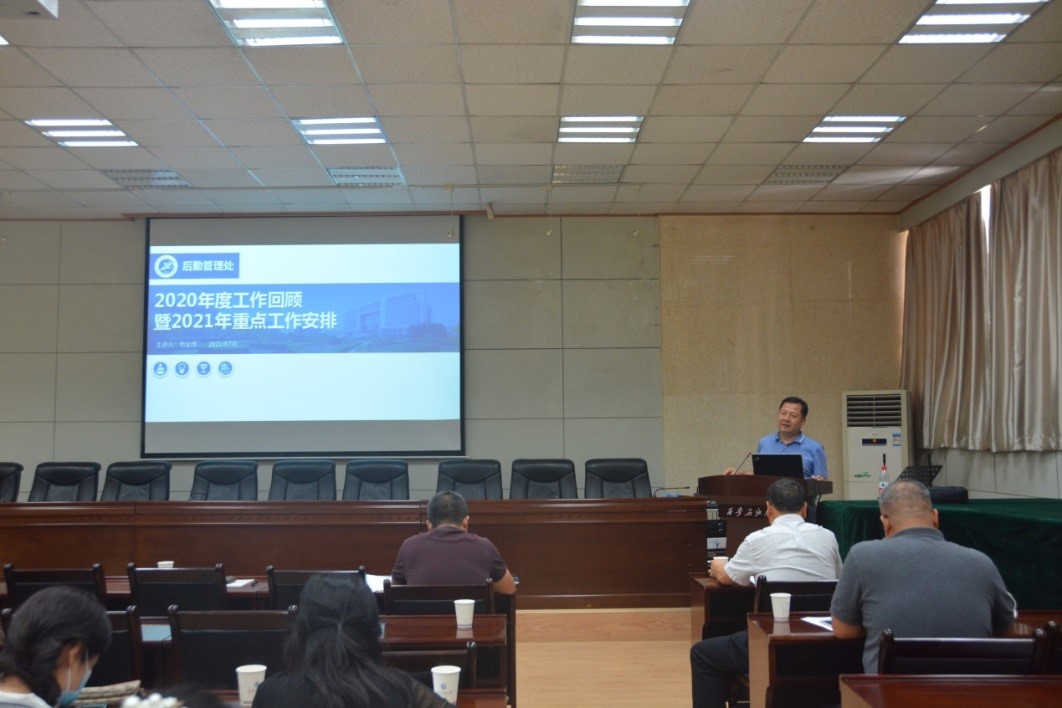 隨后,茍金虎處長對后勤2020年的工作成效進行了簡要回顧,對全體職工共同努力取得的成績表示積極肯定和鼓勵,再進一步結合學校今年工作要點、主要工作任務分解表安排部署給后勤的工作和要求,把上半年的工作的具體落實和完成情況進行了總結、分析。同時,又根據當前工作實際,把暑假及下半年工作進行了安排,重點要落實、實施好各項新學期開學準備工作;新建學生公寓宿舍的設施安裝配置、教室功能改造等維修改造,以及校園整治工程,同時要嚴密做好暑期疫情常態化防控,尤其是各校區室內重點區域消殺和通風,加強教學、科研及學生公寓等門禁管理;做好暑假留校學生的生活及學習保障;落實好暑期室內外重點區域(尤其是鄠邑校區)的防汛抗汛工作;加強暑期工作人員防暑降溫、勞動保護及規范操作管理等。他還要求,下半學期在完成好疫情防控常態化下各項保障和服務工作的同時,要重點做好70周年校慶服務保障、落實好文明校園創建等工作。