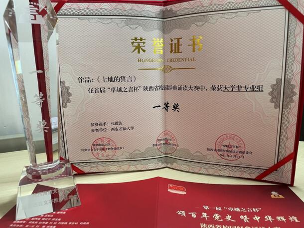 自黨史學習教育開展以來,馬克思主義學院積極組織豐富多彩的學習教育活動,號召廣大同學踴躍參加全省的獻禮活動。作為馬克思中國化專業的孔微波同學,一直喜愛朗誦和演講,從活動開始之際,就積極參與,認真準備。結合自身所學的專業知識與誦讀經典相結合,選取了《土地的誓言》這一感人的作品,經過初賽、復賽等多輪選拔,最終在大賽線下展演中獲得大學非專業組一等獎的好成績。