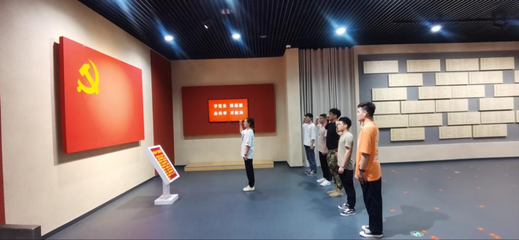 參觀結束后,班級里的黨員同志們在展覽廳內面向黨旗自發地重溫入黨誓詞,回顧入黨時的錚錚誓言,立志奮進新時代,啟航新征程。