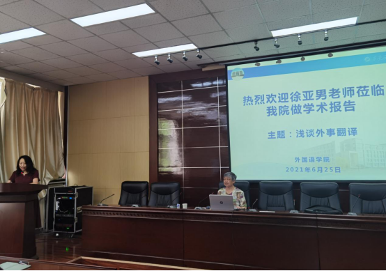 為慶祝學校建校70周年,加強學術交流,促進學科發展,我院組織了系列學術講座活動,特邀請前外交部翻譯室主任徐亞男老師于6月25日上午在雁塔校區第五會議室舉辦題為“淺談外事翻譯”的專題報告會。院長于艷英、副院長劉輝、陳武及全體師生參加了講座,講座由劉輝副院長主持。
