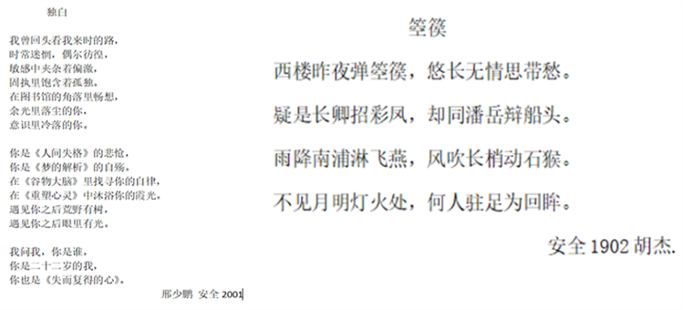活動共分為兩部分,一是“心靈悄悄話”。通過在鄠邑校區新食堂門前搭建帳篷、懸掛橫幅,活動期間邀請同學們在橫幅上簽名,同時邀請同學們在紙條上寫下自己想表達的內容并放在收集盒中;并從另一個盒子中抽取紙條得到他人對自己的鼓勵或表達的心理困惑。如遇表達困惑的同學留下了聯系方式,抽中紙條的同學可以與他進行溝通。此環節旨在通過互換小紙條這一舉措,增進同學之間的感情,拉近同學之間的距離。二是心理原創詩歌大賽。通過詩歌的創作來記錄大學生心理成長中的點點滴滴,提醒大學生要珍愛生命,關愛自已身心的健康發展進而關愛他人,關愛社會。讓我們以文字為載體傳遞人文情感,釋放心理壓力,抒發內心情懷,在快節奏中停下腳步,用文字傳遞彼此間真摯的情感。通過僅一個多月的收集評選,選出一等獎1個、二等獎2個、三等獎3個、優秀獎5個。優秀作品學院將頒發獎狀,以資鼓勵。以下為部分優秀作品展示。