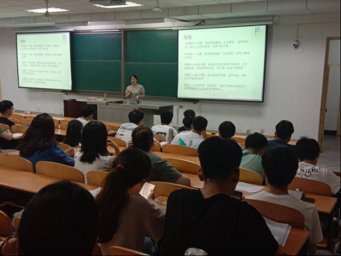 講座過程中,兩位老師結合實例用幽默風趣的話語營造輕松愉悅的氣氛,吸引眾多同學專心致志地聽講。武絨老師向學生介紹大學英語四級考試中聽力部分的考試題型,考試目的以及考試過程中的注意事項,并講授了聽力考試中三種題型的應試技巧。劉西娟老師主要講授四級作文的寫作技巧及考試中寫作的注意事項,并對不同類型的真題范文進行深入淺出地分析。